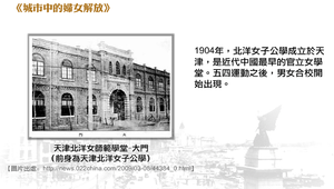 婦女的解放,也是首先從城市中展開;1904年,北洋女子公學成立於天津,是近代中國最早的官立女學堂;五四運動之後,男女合校開始出現。因為受到西風東漸的影響,民初社會的生活模式與教育思想開始變得不一樣,尤其是較早開發的沿海大城市,帶動了城市婦女的解放風潮,從外顯的衣著部分到內在思考模式都有顯著的改變。