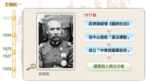 1917年到1928年是中華民國邁向統一的歷程,1917年,段祺瑞破壞《臨時約法》,孫中山發起「護法運動」,在廣州成立「中華民國軍政府」,國家陷入南北分裂局面;1924年,孫中山手訂《建國大綱》;1925年,「國民政府」於廣州成立,1927年3月攻克上海、南京。因處置共產黨問題及權力爭鬥,國民黨形成「寧漢分裂」。1928年,蔣中正復出,重任北伐軍總司令,改用「青天白日滿地紅旗」,12月29日,張學良下令東北改懸「青天白日滿地紅旗」,中國在形式上恢復統一。