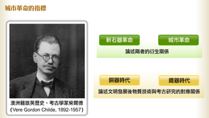 澳洲籍旅英歷史、考古學家柴爾德提出「新石器革命」、「城市革命」、「銅器時代」、「鐵器時代」等術語,成為研究大河文明的重要參照理論。他認為城市革命具有十大指標。