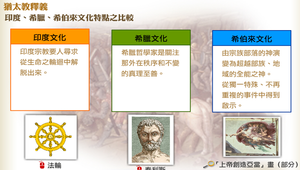 印度宗教要人尋求從生命之輪迴中解脫出來;希臘哲學家關注外在秩序和不變的真理至善;而希伯來文化的特色與思維則有很大不同:由宗族部落的神演變為超越部族、地域的全能之神,從獨一特殊、不再重複的事件中得到啟示,這種普世性的信仰具有強烈的超越意識。