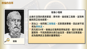 西元前594年,梭倫出任雅典首席執政官,鑑於社會貧富懸殊已達極點,平民與貴族間仇恨日益加深,乃推行一系列改革措施,成為雅典民主發展的重要階段。