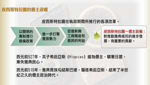 西元前560年,皮西斯特拉圖在貧民黨支持下,以武力奪得政權,建立了僭主政治。但由於貴族黨和富人黨的反對,曾兩度被逐出雅典,直至西元前541年再以武力攻占雅典,重建僭主政權。