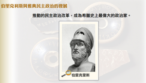 伯里克利斯重要改革措施包括:創設陪審法庭、公民大會成為最高權力機關、最高行政機關-五百人會議,行使政府職能 、實施公職薪俸制。