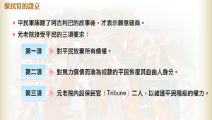 元老院迫於情勢,接受了平民的三項要求:對平民放棄所有債權、對無力償債而淪為奴隸的平民恢復其自由人身分、元老院內設保民官二人,以維護平民階級的權力。
