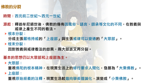 西元前二世紀到西元一世紀間,佛教分裂了。在釋迦牟尼過世後,佛教的傳佈因為風俗、語言、師承等文化的不同,而在教義與戒律上產生不同的看法,而分裂為不同部派。可以分成根本分裂及枝末分裂。雖然佛教後來分成了許多派別,但基本的思想仍以大眾部和上座部為主。
