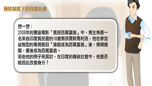 從電影「貧民百萬富翁」中的主角,從貧民一夕致富後,成為百萬富翁的現象,探討在印度的傳統社會中,他是否能因此改變身分;其實傳統印度是一個出身取向而非成就取向的社會。對人,只問其出身如何,而不問其能力、成就、品行,因此主角不因為變成富翁而改變其原本的階級。