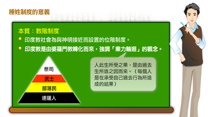 種姓制度本質上是一種教階制度,是印度教社會為與神明接近而設置的位階,每個位置都表示與神接近的程度,地位愈高,與神愈近。種姓的幾個特點,包括:社會分隔、種姓間的上下等級、飲食與社交限制、日常生活與宗教生活的限制、職業與婚姻的限制等。種姓制度可說是由印度教加以神聖化的社會分工形式,它反映出印度人的價值取向,每個階級在此制度下都受到嚴格的規範,不得逾越。