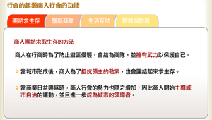 商人行會的功能可分成四大類,分別是「謀求生存」、「壟斷商業」、「生活互助」及「宗教與教育」。在歐洲商業復興初期,商人在行商時為了防止盜匪侵襲,會結為商隊 ,並擁有武力以保護自己。當城市形成後,商人為了抵抗領主的勒索,也會團結起來求生存。慢慢的,當商業日益興盛時,商人行會的勢力也隨之增加,因此商人開始主導城市自治的運動,並且進一步成為城市的領導者。