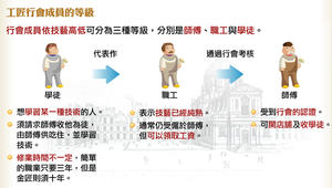 工匠行會的成員依技藝高低可分為三種等級,分別是師傅、職工與學徒。學徒,是指想要學習某一技術的人,修業的時間不一定,較簡單的職業學習三年即可,但若是金匠則須十年之久。 當學徒期滿後,他必需製作一個「代表作」來顯示自己的技藝已純熟 , 而後才能成為職工。成為職工後通常仍受僱於師傅,只是可以領取工資。當職工通過行會的技術考核之後,取得師傅資格。就能夠開自己的店舖並且收學徒。