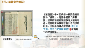 《舊唐書》中<西戎傳>稱拜占庭帝國為「拂菻」,傳記中關於「拂菻國」建築的精確描寫頗多令人稱奇之處,從圖片當中就可以看出今日伊斯坦堡,也就是古拜占庭都城(即今日君士坦丁堡)居高臨下的宏偉氣勢。根據現代西方考古學之父許里曼的考證,終於證明這座金門就是拜占庭首都君士坦丁堡 (就是現在伊斯坦堡) 的主城門。黃金城門有三重,從上到下用黃金裝飾,在陽光下金光燦爛,第二重門樓中掛有一大金秤,有十二個金球裝置的計時器,此種建築在當時實屬少見。