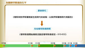 透過年表了解穆罕默德從出生到逝世的事蹟,並從穆斯林的角度觀看穆罕默德的生平。在穆罕默德誕生前穆斯林稱之為「蒙昧時代」;穆罕默德開始傳教直到逝世被稱為「先知穆罕默德時期」。