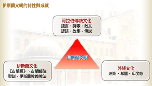 伊斯蘭文化是阿拉伯傳統文化,包括:語言、詩歌、散文、諺語、故事、傳說等。還包函《古蘭經》、古蘭經注、聖訓、伊斯蘭教義教法等等。最後是受外族文化影響,包括:波斯、希臘、印度等等的基礎上,吸收古代東西方文化的精華,逐漸融合、發展而成。