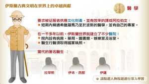 阿拉伯人出身原始閃族,由於欠缺文化背景,所以相當渴望吸收世界文化的精髓,他們要求被征服者供應原有的文化財產,然後相當有效率的譯成阿拉伯文,所以在短期內能精通希臘羅馬乃至於波斯的醫學,並有自己的專家。 早在一千多年以前,伊斯蘭世界就建立了不少醫院,院內設有病房、藥局、圖書館、娛樂室及浴室。另外醫生行醫須取得國家執照才能執行。