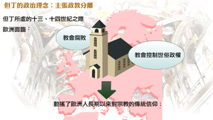 但丁所處的十三、十四世紀之際,歐洲面臨教會腐敗、教會控制世俗政權,這些現象動搖了歐洲人對宗教的傳統信仰;另一方面,人們對現實生活的關注也明顯提升。但丁反對教皇干涉世俗事務,抨擊教皇與許多教會人士的貪婪、欺詐、殘忍與偽善;但丁認為義大利動亂的根本原因,是教皇對義大利政治的干涉,因此他提出了「政教分離」的政治思想,並指出當前的教會由於背離了基督精神而罪孽叢生,他期望教皇能成為上帝的忠實委託人。