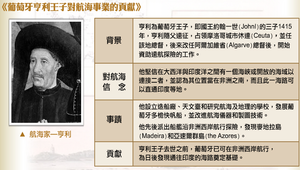 亨利王子設立造船廠、天文臺和研究航海及地理的學校,發展葡萄牙多桅快帆船,並改進航海儀器和製圖技術。先後派出船艦沿非洲西岸航行探險,發現麥地拉島(Madeira)和亞速爾群島(the Azores)。