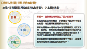 地理大發現對於歐洲社會經濟的影響:使歐洲的商業發生了巨大的變革、加速資本主義的發展、近代殖民制度的建立。