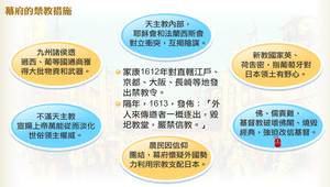 家康在1612年對直轄江戶、京都、大阪、長崎等地發出禁教令。隔年,1613,發佈:「外人來傳道者一蓋逐出,毀圯教堂,嚴禁信教。」