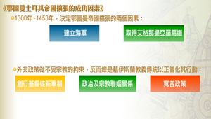 從1300年到1453年,兩個因素決定鄂圖曼帝國的擴張:建立海軍、取得艾格那提亞羅馬道。其次,鄂圖曼土耳其的外交政策從不受宗教的拘束,反而總是藉伊斯蘭教義傳統以正當化其行動,具體顯明的例子如:創行基督徒新軍制;政治及宗教聯姻關係;寬容政策,這些都是切應時局變化的務實策略。