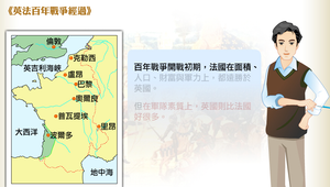 分成四個階段介紹英法百年戰爭的經過。1340年,英國海軍擊潰法國艦隊,控制英吉利海峽。以後英軍開始進攻法國,戰爭就在法國本土展開。長達百年的戰爭持續至1453年,英法兩軍在波爾多附近決戰,英軍全軍覆沒,英國在法國的領地幾乎被法國收回,英國百年戰爭就此結束。