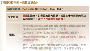 1603年都鐸王朝的伊麗莎白一世終身未婚,過世後由血緣關係最接近的蘇格蘭國王詹姆士六世繼任為英王詹姆士一世,開啟斯圖亞特王朝。他堅信君權神授的學說,認為國王有專制的權力,引起英國國會不滿。又因信仰天主教,壓迫清教徒改信英國國教,1620年間有批清教徒乘著「五月花」號橫渡大西洋,移民到北美洲的普利茅斯,從此展開清教徒在新大陸的殖民活動,以及日後爆發的美國獨立運動。