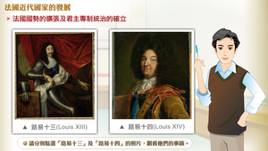 法國國勢的擴張與君主專制統治的建立可從路易十三及路易十四說起。路易十三親政後,1624年起任用李希留為首相。李希留以國家利益為最高原則,法國國勢在其掌舵下迅速崛起。1643年路易十四即位,首相馬薩林為法國在三十年戰爭贏得勝利。1661年路易十四親政,積極推行各種經濟改革,包括成立法屬東印度公司和西印度公司,從事海外殖民的競爭。此外積極獎勵文教事業,使法語成為西方外交界通用語言。1666年創立法蘭西科學研究院,成為國家科學研究的重鎮。