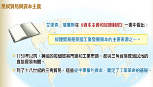 以艾里克.威廉斯在《資本主義和奴隸制度》一書中的論點,探討黑奴貿易與資本主義的關聯。奴隸貿易是英國工業發展資本的主要來源之一,黑奴的流動支持整個三角貿易體制。