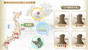 蘭學的發展,由長崎、江戶、京都、大阪擴展至各藩國;由醫學、天文地理延伸至軍事等各種學科;人物方面有杉田玄白、貴川甫周、大槻玄澤、宇田川玄等「江戶蘭學四大家」。