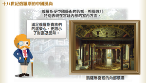 俄羅斯彼得大帝在位時期的「歐化運動」中,藉由歐洲文化的傳入,也興起一股在俄羅斯極為盛行的「中國風尚」。此時俄羅斯受中國藝術的影響,視覺設計特別表現在宮廷內部的室內方面;俄羅斯的「中國風」熱潮在凱薩琳二世當政時期(1762?1796)達於全盛。