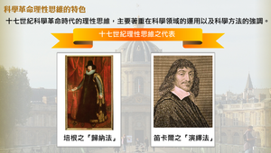 十七世紀科學革命時代的理性思維,屬於科學領域的運用以及科學方法的強調。尤其是培根的「歸納法」與笛卡兒的「演繹法」,最具代表性。