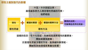 在十七世紀,科學成就證實理性的重要後,理性思維及理性方法,就突破科學領域,開始在其他領域逐漸產生影響。因為理性思維而締造新的世界觀,尤其是十七世紀形成的大宇宙機械觀;且將分析科學方法應用於人文社會學方面;而理性主義的產生,造成十七世紀時期以及其後的人,尤其啟蒙運動時期的西方人,出現了「近代心靈」。