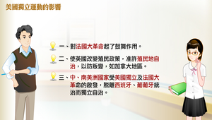 美國獨立運動的影響:對法國大革命起了鼓舞作用;使英國改變殖民政策,准許殖民地自治,以防叛變,如加拿大地區;中、南美洲國家受美國獨立及法國大革命的啟發,脫離西班牙、葡葡牙統治而獨立自治。