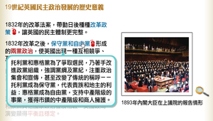 英國19世紀的民主政治發展,具有幾個重大的歷史意義:1832年改革法案使英國民主體制更完整。1832年改革之後,選民人數增加了,也形成兩黨政治,使英國出現一種互相競爭、互相監督又互相制衡的政黨政治。19世紀時,英國的經濟發展非常迅速,中產階級的經濟力量很強大,加上工人階級在憲章運動後處於衰弱狀態,都讓氣氛趨向自由放任的改革。和歐洲其他國家政治發展相較,英國政局演變顯得平衡且穩定。