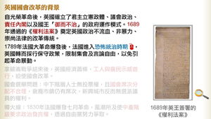 自光榮革命後,英國確立了君主立憲政體、議會政治、責任內閣以及國王「御而不治」的政府運作模式。1689年通過的《權利法案》保障了英國人民生命財產不受政府的不法侵害,同時,奠定此後英國政治不流血、非暴力、崇尚法律的改革傳統。1789年法國大革命爆發後,法國進入恐怖統治時期,英國轉而採行保守政策,限制集會及言論自由,擱置一切改革,以免引起革命暴動。最後改革的導火線是1830年法國爆發七月革命,由歐洲大陸上興起的革命風潮,為英國革新派人士帶來刺激。
