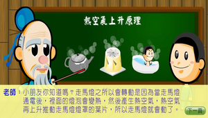 本學習物件主要是從熱空氣和摩擦力的原理來教學生;並且有模擬和詳細的步驟來製作走馬燈。學習結束後;也可利用有趣的評量來測驗自己學習的成果。