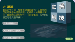 本學習物件主要為認識纖維;從衣服帶學生進入纖維的世界;並讓學生從實際的模擬實驗中;學會分辨纖維的種類。除此之外;最後還有一個小小的活動讓學生複習所學的知識;並幫助老師診斷教學與學生學習的不足點。