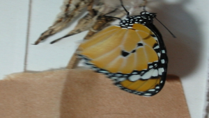 剛羽化的樺斑蝶,翅膀已經撐開,蝴蝶會休息幾個鐘頭,待翅膀硬化後飛走。 漳興國小陳佳呈老師提供