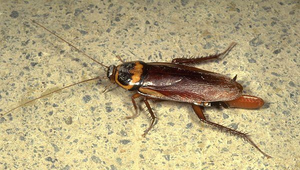 蜚蠊目蜚蠊科,頭至翅端長34~40公釐。胸部黑色,有一圈橙黃色色斑;上翅紅棕色。本種近似美洲蜚蠊,除體型稍小外,成蟲上翅前端兩側各有一條黃色條紋是區分鑑定的特徵。 南投縣自然與生活科技輔導團輔導員 南投縣水尾國小左漢榮主任提供