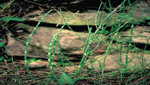木賊科木賊屬,具橫走地下莖和直立地上莖,莖高可達100公分以上,直立莖徑寬0.1~0.8公分,綠色中空;節間長4~10公分;表面粗糙並有數條溝和隆起的稜,溝內具氣孔帶。葉極小退化成鞘齒狀,環生在節上。孢子囊穗頂生,成盾狀六角形。產在中低海拔向陽處的溪流兩岸或乾河床及道路旁。 南投縣自然與生活科技輔導團輔導員 南投縣水尾國小左漢榮主任提供