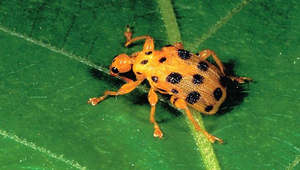 鞘翅目捲葉象鼻蟲科,為完全變態昆蟲,生活史需經卵、幼蟲、蛹及成蟲四個階段。體長約7公釐左右,體色為橙色。前胸背板、翅鞘及小盾板具有黑色圓形斑點,翅鞘斑點處疣狀隆起不明顯,後腿中部具有明顯的黑色橫紋。成蟲主要出現在中低海拔山區,寄主植物為殼斗科植物。 南投縣自然與生活科技輔導團輔導員 南投縣水尾國小左漢榮主任提供