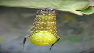 琉球青斑蝶前蛹褪皮。將蛻變成蛹。 漳興國小陳佳呈老師提供