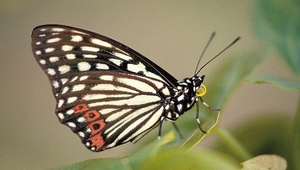 鱗翅目蛺蝶科,翅展約70~78公釐。翅膀兩面斑紋色彩幾乎相同。外觀略似青斑蝶類,但後翅肛角及附近亞外緣共有四枚鮮明紅色斑紋,特殊而無近似種。雌雄外觀幾近相同。 南投縣自然與生活科技輔導團輔導員 南投縣水尾國小左漢榮主任提供