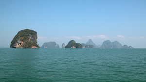 這是位於泰國普吉島南邊的著名遊覽勝地「攀芽灣」海域 ,這裡的石灰岩地形,是因地殼上升及海水侵蝕而形成的 ,有著名的「007島」、「割喉島」等。 光明國小連建炫提供