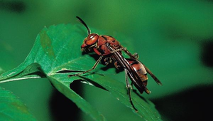 膜翅目胡蜂科,體長約20至26公釐,體色為紅褐色,腹部具有黑色橫紋。主要生活在中低海拔山區。圖中的褐長腳蜂正在休息並清理翅膀。 南投縣自然與生活科技輔導團輔導員 南投縣水尾國小左漢榮主任提供
