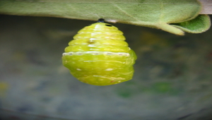剛蛻變的琉球青斑蝶蛹。腹部會逐漸縮短,翅膀漸漸拉長,成為蛹的特定外型。 漳興國小陳佳呈老師提供
