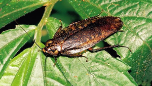 蜚蠊目光蠊科,頭至翅端長40~45公釐。體色整體呈黑褐色;前胸背板中央具大塊黑色斑紋;上翅散生許多大小不一的黑色斑點。 南投縣自然與生活科技輔導團輔導員 南投縣水尾國小左漢榮主任提供