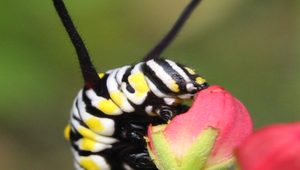 這是樺斑蝶末齡幼蟲的頭部特寫,牠正在吃馬利筋的花苞。 漳興國小陳佳呈老師提供
