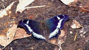 鱗翅目蛺蝶科,翅展約50~65公釐。翅膀表面藍黑色,上後翅各有一條略有金屬光澤的淺藍色帶狀斑紋。翅膀腹面斑紋色彩雖雜亂不鮮明,近觀卻有微略絨布質感,後翅中室尚有一枚極小的白斑。雌雄間差異不甚明顯。 南投縣自然與生活科技輔導團輔導員 南投縣水尾國小左漢榮主任提供