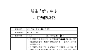 藉由「新生打預防針」事件為媒介,閱讀「新生鮮事多」這本對一年級新生而言,「字有點多、書有點厚、也不是彩色的繪本的童書」,但經由老師刻意的安排和指導,抽象的符號和有意義的語言、意象,開始碰出火花。