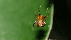 說明:雌蛛體長約4-5mm,背甲紅褐色。腹部圓球形,腹部背面具有一個大而明顯的紅斑。雄蛛體長約2-3mm,體色和花紋與雌蛛相近。分佈於低海拔地區。屬於常見的蜘蛛,在灌叢枝椏間結網,網不規則形,常常會利用枯葉置於網中,並且躲在枯葉下方。