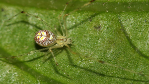 說明:圖為棘腹金姬蛛雌蛛。雌蛛體長約3-5mm,背甲黃褐色。步足極細長。腹部背面具有紅、黃、黑和白色橫帶與斑紋,不過個體間的變異很大,末端有四或六根黑色剛毛,因而得名。雄蛛體長約2-3mm,體色和花紋與雌蛛相同,但腹部稍微狹長。分佈於低海拔地區。喜歡出現在溪流邊或河岸附近的樹木、灌叢等葉背。網為不規則狀。雌蛛有護卵及護幼行為。